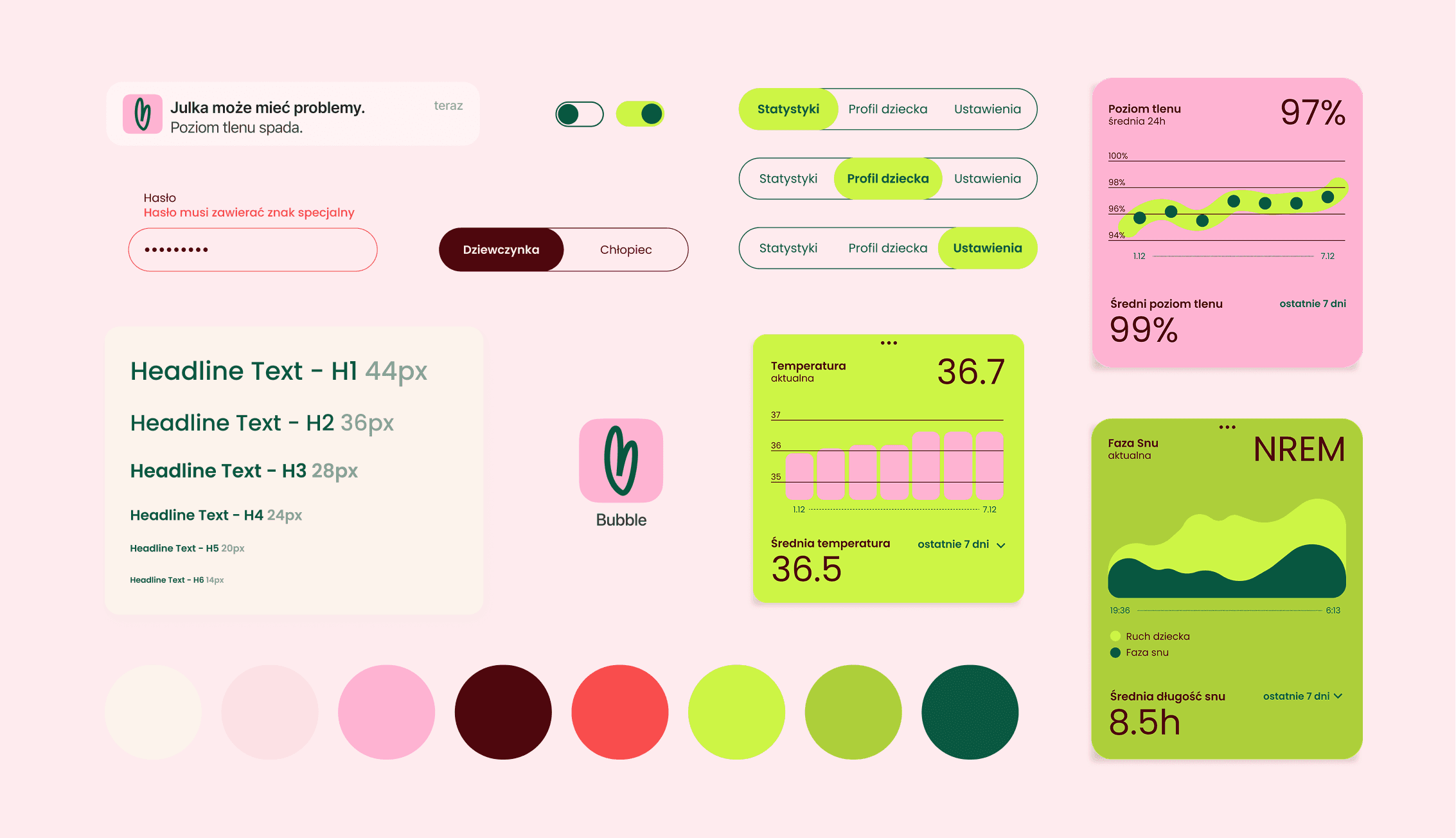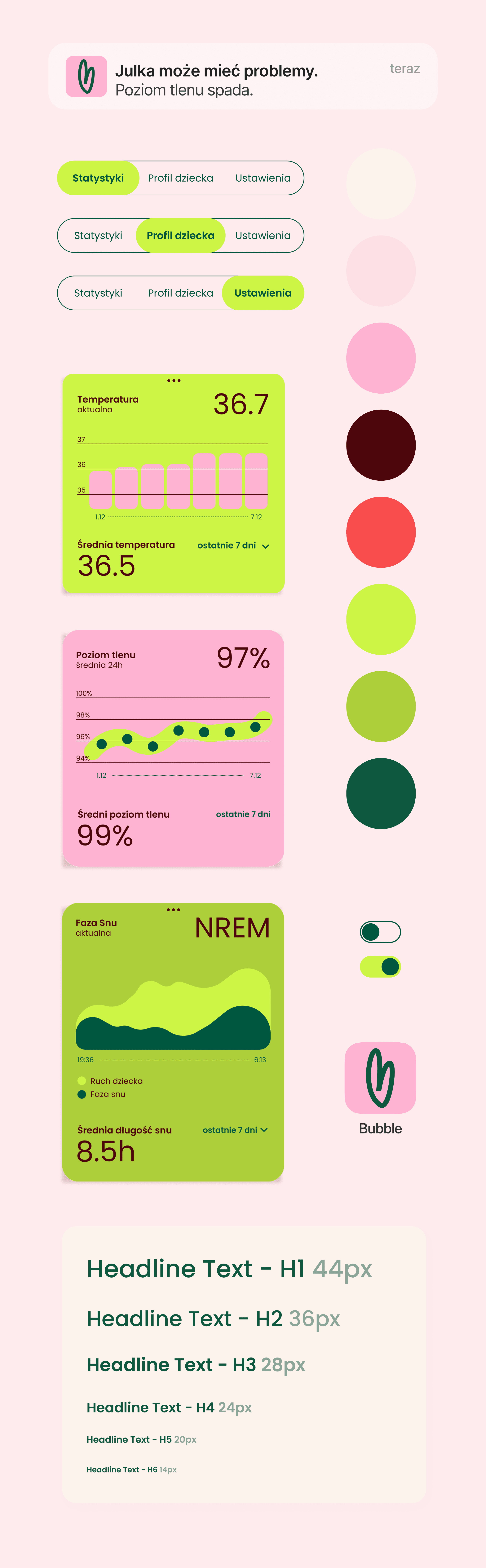 The mobile app pairs with a sensor placed near the baby. The main screen shows only the essentials: oxygen level, body temperature, sleep phase. In case of danger, a emergency mode takes over the interface, guiding the parent with simple instructions and enabling a one-tap emergency call.